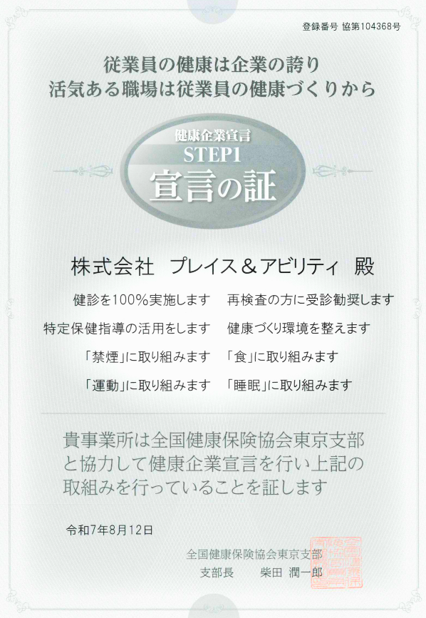 このたび、当社株式会社プレイス&アビリティは、2025年8月12日に全国健康保険協会(協会けんぽ)東京支部に「健康企業宣言」を行い、「宣言の証」を取得いたしました。