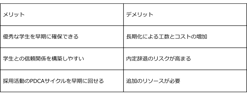 一方で、採用活動の長期化による工数とコストの増加が最も大きなデメリットです。インターンシップの企画・運営、早期選考の実施、長期にわたる内定者フォローなど、通常の採用スケジュールよりも多くのリソースが必要になります。
