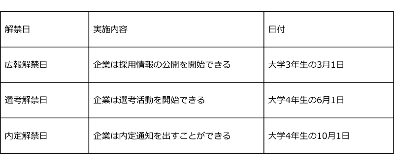 広報解禁日は、大学3年生の3月1日です。この日以降、企業は採用情報の公開、ナビサイトへの掲載、会社説明会の開催、エントリーシートの受付を開始できます。