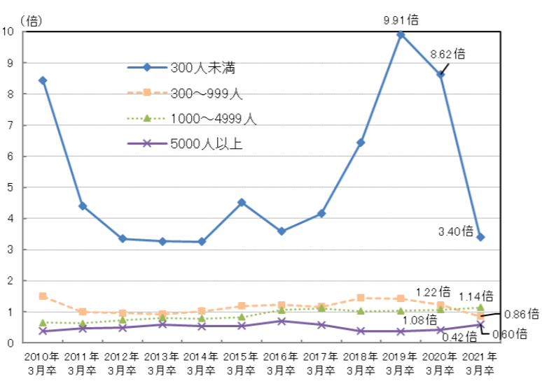 しかし、中小企業・ベンチャー企業の採用はとても難しく、売り手市場と言われている市場の中でも中小企業・ベンチャー企業では、求人倍率がとても高くなっています。